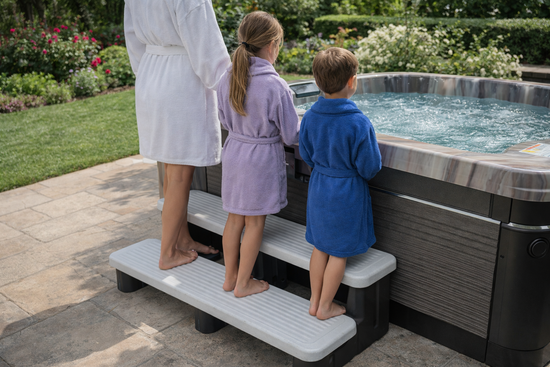 Powerstep is DOUBLE WIDE spa stair making it easier for multiple guests to enjoy the hot tub experience.